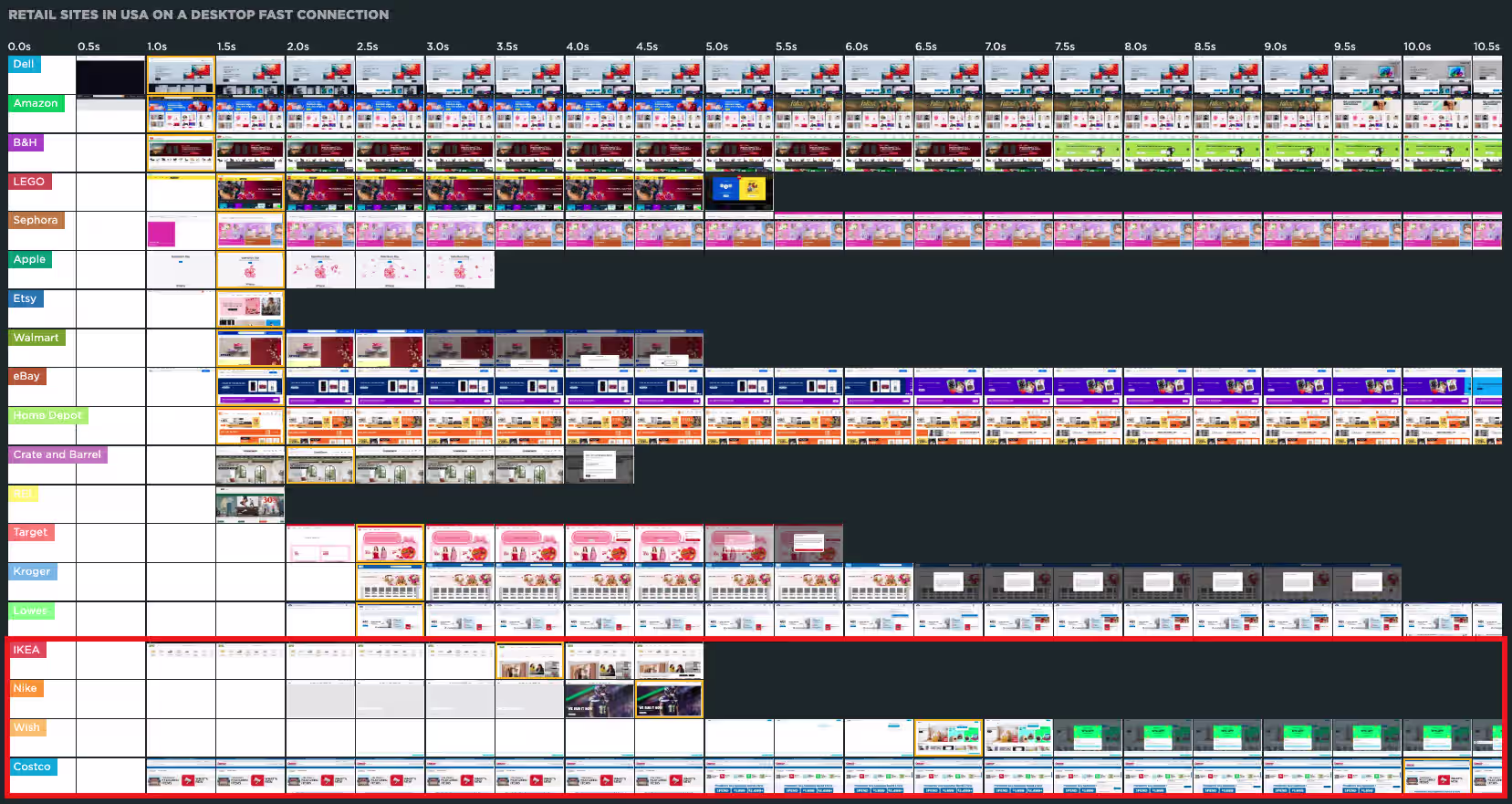 Notably, when viewing USA > Retail > LCP with a Fast connection, I see that both Nike and Wish record a high LCP for some reason (Costco actually reports the highest LCP of the group, but that is related to a layout shift):