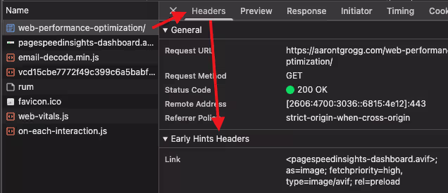 Once implemented, however, testing whether or not your Early Hints are working is fairly straight-forward; here is an example in Chrome’s DevTools: