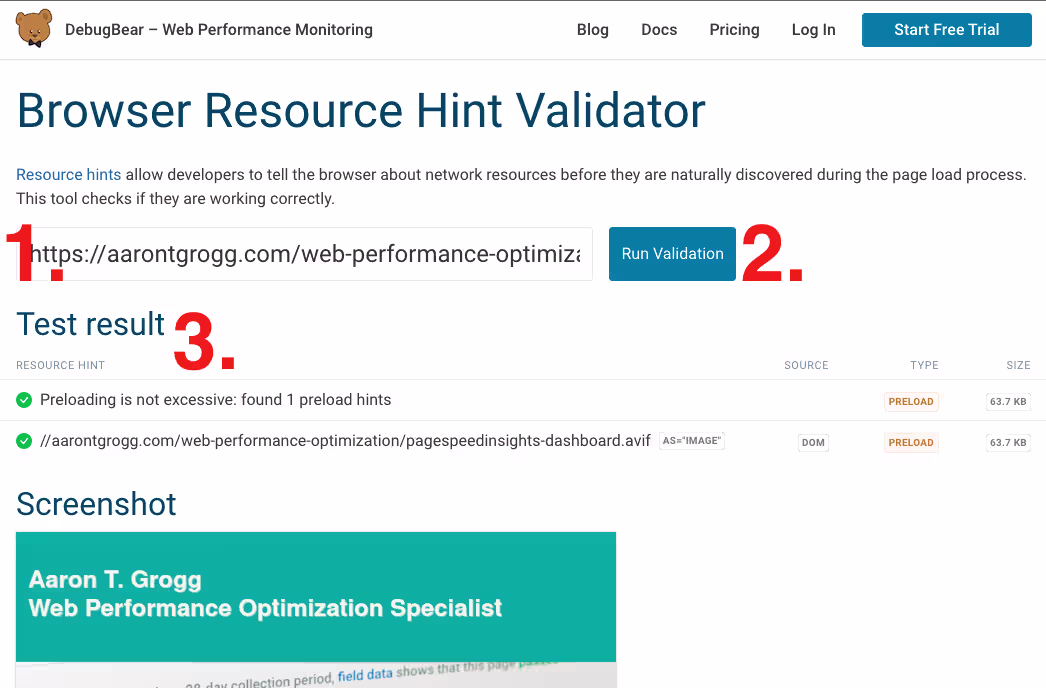You can also test whether or not your Resource Hints are setup correctly using something like the free online validator offered by DebugBear. As difficult as 1) pasting a URL, 2) clicking a button, and 3) waiting a couple seconds for the page to return your results: